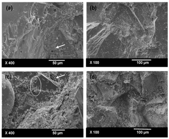 Figure 4c,d shows the natural granite micrographs. Comparing granite to ASPU, one can notice that granite stone presented a higher incidence of voids and a greater particle detachment after the bending stress. The SEM micrographs confirmed the results found in porosity tests, with the ASPU presenting three times less porosity than the granite.