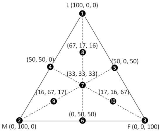 Figure 1 shows a complete ternary diagram developed in the experimental numeric-modeling grid Simplex (Simplex-Lattice Design) [] to obtain greater packaging in ternary mixtures. To determine the proportion of the greatest packaging of the 10 mixtures, all were tested based on the standard ABNT/MB-3388 Brazilian standard (1991)—Determination of the minimum index void ratio of non-cohesive [].