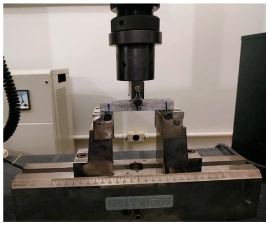 The three-point flexural strength test was performed on our INSTRON universal testing machine, model 5582, based on F Annex of ABNT/NBR 15845 Brazilian standard []. The specimen’s dimensions were 100 × 25 × 10 mm and the test was performed under 0.25 mm/min loading rate, 100 kN load cell, and 80 mm distance between the two points (Figure 2).