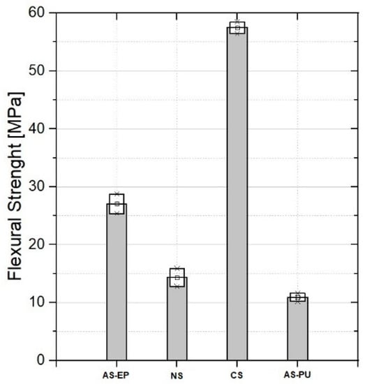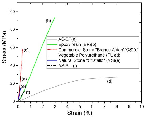 The natural PU resin has lower flexural strength (23 MPa) compared to epoxy resin (93 MPa), which may be related to the polyurethane resin degree of polymerization. However, the study of the stoichiometric quantity between the NCO/OH ratio, responsible for the degree of polymerization, which involves the main reaction sites present in the prepolymer and polyol, was not carried out. Reactions with an excess isocyanate may occur along with parallel reactions that harden the material. On the other hand, reactions with an excess of hydroxyls cause the polymer to soften through the reduction in intercrossed bonds [], which explains why AS-PU obtained a low flexural strength compared to the other tested stones.