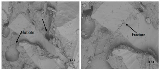 Figure 7a,b show AS-PU’s fracture surface SEM micrograph, illustrating the material filling all interstices between the larger grains. Bubbles not eliminated by the vacuum process appear within the matrix, which were already confirmed by the porosity test. It is possible that the bubbles were also generated during the polymerization process between the isocyanate (NCO) and hydroxyl (OH) groups, in which occur parallel reactions mainly involving NCO + H2O forming high molecular weight compounds such as poly (urethanes/ureas) with excellent mechanical properties. The NCO + H2O expansion reaction results in urea formation releasing CO2 and forming bubbles. The release of curing process CO2, added to the water vapor release at the time of pressing, are evidence of defects formation []. Figure 6b points out a quartz grain that fractured after the artificial stone was produced.