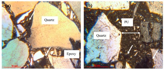 Petrographic slides of artificial stone with quartzite with epoxy AS-EP (a) and quartzite with polyurethane AS-PU (b).