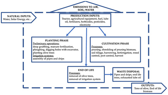 System boundaries of the process from the preliminary operations and the planting phase to the harvest of olives.