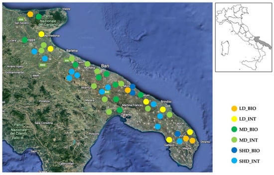 Map of the Apulia region with the location of the analyzed olive-growing systems.