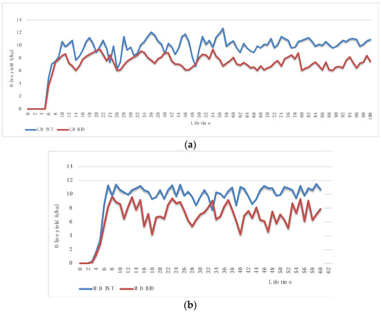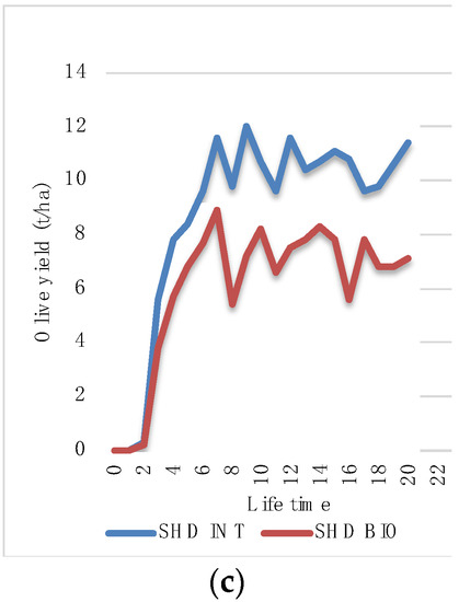 Productivity curve in terms of olive yield (t/ha) during the lifetime of the three growing systems for both integrated (INT) and organic (BIO) farming: (a) traditional systems (LD); (b) intensive systems (MD); (c) super intensive systems (SHD).