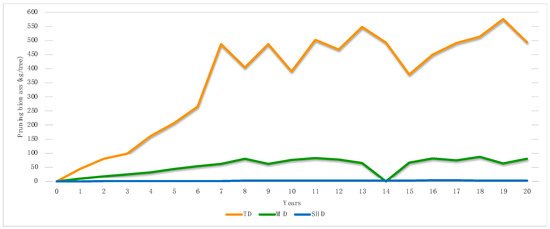 Pruning biomass (kg/tree) from the traditional (LD), intensive (MD), and super-intensive (SHD) growing systems.