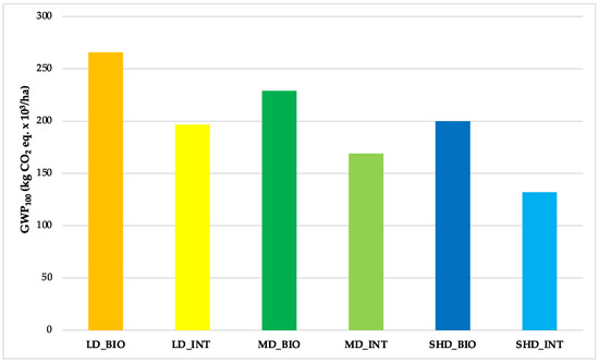 The same situation happens when comparing farms following the integrated method: the LD_INT system has the higher value of GWP100 (328.33 kg CO2 eq/t) followed by 296.49 kg CO2 eq/t for MD_INT and 244.44 kg CO2 eq/t for SHD_INT.