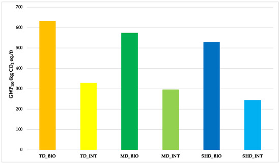 - Considering 1 ha as a functional unit, it can be seen that organic farms have a higher GWP100 compared to integrated farms; particularly, among the TD cropping systems, the BIO farming shows + 57,45% of GHG emissions compared to the INT farming; in the same way, the MD_BIO shows + 57,54% of emissions compared to MD_INT; and SHD_BIO shows + 60,24 % of emissions when compared to SHD_INT, in accordance with the study by Clark S. [58].