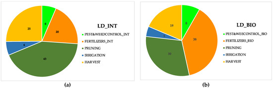 In particular, in comparing organic farms, it was clear that LD_BIO was the most impactful system with an emission of 266 × 103 kg CO2 eq/ha. In addition, for the integrated farming, LD systems show the highest GHG emissions (197 × 103 kg CO2 eq/ha).
