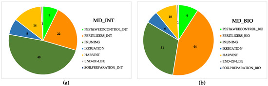 Regarding pest control, the main pests present in the Apulia region were considered. The number of treatments and the amounts of active substances per hectare were applied following the Integrated Pest Management method for INT cases and Regulation (EU) 2018/848 of the European Parliament [54] on organic agriculture for BIO cases (Table S3).