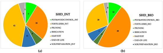 In the LCA analysis, for agricultural machinery used, the roof shelter was also considered. The machines that are not included in the databases (for example, straddle-harvesting machine, flail mower, and elevator and pruning machines for the SHD) and their emissions were reproduced by a “General Agricultural Machinery” process. The tractor emissions were used by modifying them according to the specific machinery operation and by consulting the production company’s website and technical sheets (weight and consumption/per working hour).