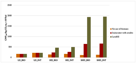 Results remain unchanged when it is considered that olives yield the FU (1 ton), because organic farming has a higher GWP100 regardless of the growing system; in fact, in Figure 6, it can be observed that the LD_BIO system shows higher values, followed by the MD_BIO system, and the SHD_BIO system with the lowest emissions.