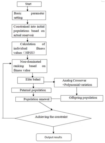 The reservoir ecological operation problem is characterized by high nonlinearity, a complex objective function, and many constraints. The traditional multi-objective optimization algorithm suffers from a low operational efficiency and difficulty in convergence when solving this model, but the NSGA-II adopts non-inferior solution fast sorting, congestion distance calculation, and elite retention strategy, which can improve the computational speed and maintain a better distribution of solution sets in solving multi-objective problems and has been widely used to solve multi-objective optimization problems. To this end, in this study, the NSGA-II [24] was used to solve the reservoir ecological operation model. The specific process is shown in Figure 2.