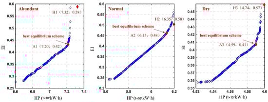In the study, a reservoir ecological operation model was constructed with the hydropower production (HP) and the ecological index (EI) as the economic and ecological benefit objectives, respectively. Typical years were selected for analysis in years with abundant water (2017), normal water (2006), and dry water (2007). The NSGA-II was used to solve the reservoir ecological operation model using the following parameter settings: a population size of 200, global iteration number of 200, crossover probability of 0.9, and variance probability of 0.1. The non-inferiority solution sets for each typical year are shown in Figure 4. From left to right, the sets of reservoir ecological operation strategies are for the abundant water, normal water, and dry water years.