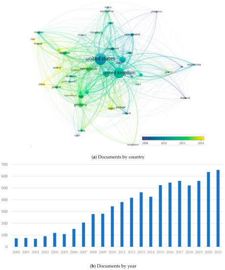 Recent studies indicate that between 2000 and 2021, the number of publications focusing on international migration increased dramatically. For example, authors affiliated with institutions in the EU and the USA published the largest share of the documents indexed in Scopus. One study [13] generalises the scientific background of migration issues and determines the current gaps; it confirms that issues related to regional and international migration were researched intensively in those countries. Since 2014, migration issues have been investigated by scientists from China, Australia, Chile, Spain, Finland and Portugal (Figure 1a). The Scopus scientific databases indexed 7 497 scientific documents on international migration (Figure 1b), and the number of documents has been increasing annually. The average annual growth rate of publications is 120%, which means that on average the growth accounted for 20% per year.
