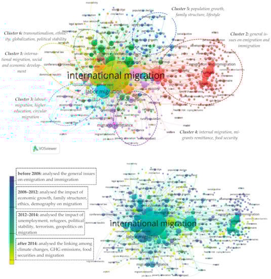 Findings of the bibliometric analysis (Figure 2) allowed determining 6 clusters and 4 evolution stages of economic research on migration process. The largest cluster in the figure (yellow) focuses on analysing international migration and social and economic development.