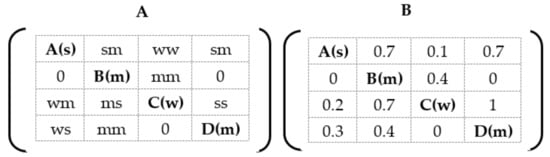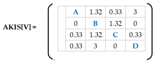 The refined matrix AKIS[III] (Figure 3) is adjusted by multiplying the strength of the linkage using the following scale: strong (s = 1), medium (m = 0.66), weak (w = 0.33), and none (n = 0), as shown in Figure 4. In AKIS[V] matrix (Figure 4), the linkages between components are transformed into the influences between them [].