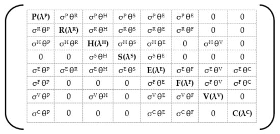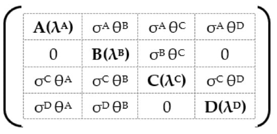 The refinement matrix (Figure 2) is converted to an information flow matrix to evaluate information flows and identify essential receivers and senders of the information within the system (Figure 5). Temel [] has noted that this transformation requires measuring three indicators among the components, including capacities to receive information (θ), learn (λ), and share information. In the diagonal cells of the matrix, the capacity of components to learn information is placed, and their capacities to transmit and receive are placed in the off-diagonal cells of the information flow matrix. For instance, the capacity of component A to receive information from other components is θA, and its capacity to share information with others is σA, and learning information is λA. Thus, the function (σA θB) in the first row and the second column (Figure 5) refers to A’s capacity to share information with B and receive information from it.