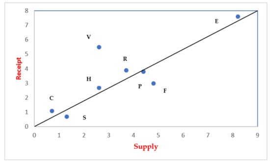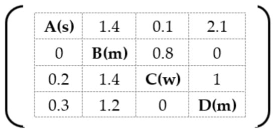 The supply–receipt structure specifies the information flow between components. The supply is the degree of the single component’s information supplements to each remaining component. Temel [] noted that the supply is the sum of each row in the adjusted matrix (Figure 7). For instance, combining the values in the first row in the adjusted matrix (Figure 7) indicates that A’s score as an information supplier is 3.6. However, the receipt is the information reception of a single component from each component. It is the sum of each column in the adjusted matrix (Figure 7) []. Illustratively, the combination of values in the first column depicts that the score of component A, as an information receiver, is about 0.5.