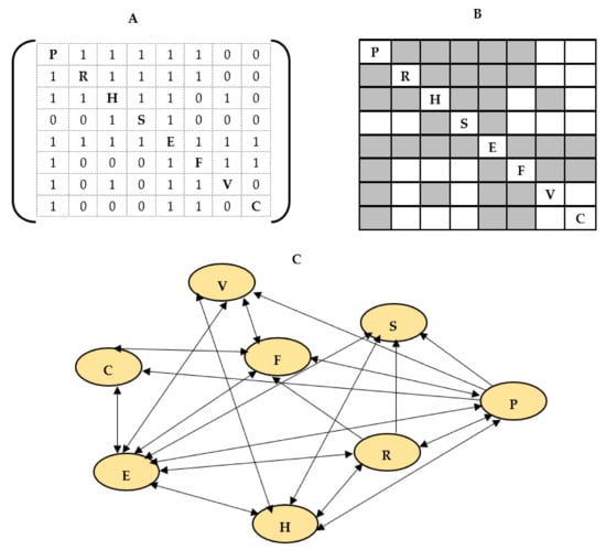 Coded matrix of agricultural knowledge and information systems in Dakahlia governorate (A), visual format of the matrix (B), and diagraph of binary linkages between components within the system (C).