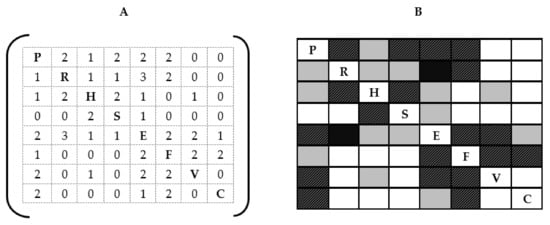 The coded linkage matrix (A) and its visual format (B) (A virtual example).