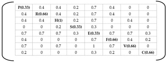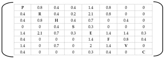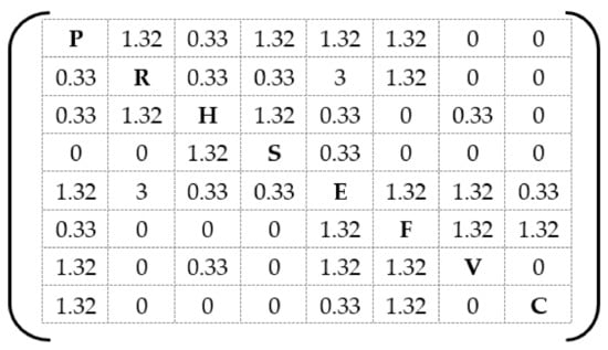 The adjusted capacity matrix is the product of each cell in the capacity matrix of AKIS (Figure 6) (except the diagonal cells) with the corresponding cell in the progressive linkages matrix (Figure 2) []. These calculations lead to the following effective capacity-weighted matrix of AKIS (Figure 7). This matrix shows an information flow structure, presenting how fluid the information in the system is.