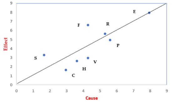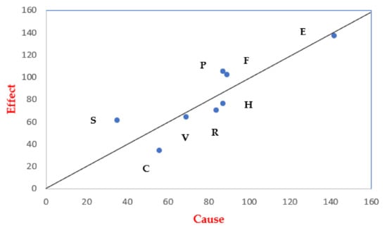 The cause structure is calculated by adding the values of each row identified in the total casual matrix. In contrast, the effect structure is determined by summating the values of each column. Based on the values of the total casual relations, the characteristics of the components are described as follows: interactive component (its influence on the other component is equal to the effect of other components on it), the dominant components (cause > influence), and sub-ordinate components (cause < influence) [].