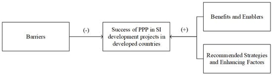 In construction project management studies, the most widely used types of factors for evaluating project success and potential success were identified as benefits and enablers, barriers, and recommended strategies and enhancing factors (e.g., [11]); hence, the same model was applied to evaluate the success of PPP in SI developments in developed countries. The next step was to identify a basket of suitable measurement criteria to measure the success of PPP in SI projects. Stakeholder satisfaction was identified by Liu et al. [12] as a highly important factor for performance measurement in PPP projects and suggested that it is important to have public-sector satisfaction (S1), private-sector satisfaction (S2), and end-user satisfaction (S3) for the success of a PPP project. Yuan et al., Liu et al., and Mladenovic et al. [13,14,15] also explained a similar perspective on the importance of satisfaction of the stakeholders for the success of PPP project. Moreover, it was concluded that S1, S2, and S3 would capture the many other diverse subfactors that lead to satisfaction, making them key to assessing the success of a PPP project; hence, they were used in this research to measure the success of PPP in SI developments in developed countries. Therefore, this research aims to evaluate the factors affecting the success of PPP in SI developments in developed countries, where success is measured in terms of S1, S2, and S3. The findings of the study deliver a solid basis for developed countries to target and achieve success through PPP in delivering SI projects.