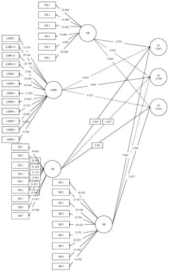 According to the presented t-values in Table 9, paths linking LSPB—S2, SB—S1, SB—S3, TB—S1, and TB—S3 have a t-value greater than 2.56. This indicates that these paths are statistically significant at the 0.01 level. Therefore, HB2b, HB3a, HB3c, HB4a, and HB4a were appropriately supported. The path linking FB—S1 has a t-value greater than 1.96, indicating that this path is statistically significant at the level of 0.05. Therefore, HB1a was also appropriately supported. According to Ekanayake et al. [52], Darko et al. [11], and Aibunu and Al-Lawati [59], higher path coefficients point to a greater impact on the variables. Therefore, it can be seen that the strongest path is between TB and S3. The dotted lines in Figure 3 illustrate the insignificant paths. The coefficients of determination (R-square) value of the dependent variables were greater than 0.3; this further confirmed the model’s quality and predictive accuracy [56].