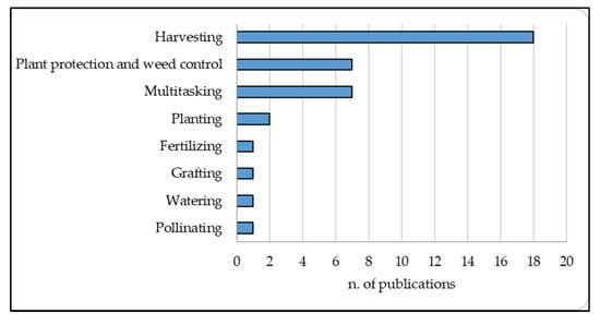The majority of reviewed works are designed to perform support in harvesting, which is mentioned in almost 47% of the manuscripts, followed by plant protection and weed control, which account for 18%. Another 18% of the papers describe robots designed to carry out multiple tasks. Additionally, although with less frequency, other tasks are mentioned, i.e., two publications show the design and development of planting robots, while for fertilizing, grafting, watering, and pollination, one study each was retrieved (Figure 2).