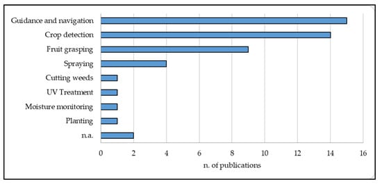 Most of the studies focus on various strategies for autonomous guidance through the adoption of tools and sensors. Hence, the first most frequently observed supporting task is guidance and navigation, comprising 31% of studies, because this task cuts across all of the main tasks. For the case of the present review, harvesting was the most described among the “main tasks”; it follows that the second main supporting task is represented by crop detection, followed by crop grasping (Figure 2). This means that 29% of the studies perform software simulation or laboratory and greenhouse tests for potentially harvested recognition activity, while 19% perform collection. Of the publications, 8% describe systems for autonomous spraying, which is part of the “plant protection and weed control” main task. The remaining supporting tasks, such as cutting weeds, UV treatment, moisture monitoring, and planting are represented by one study each (Figure 2).