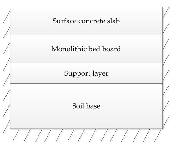 At the most unfavorable load–temperature coupling effect. The mechanical behavior of the overall ballast bed with different ballast slab thicknesses, support layer thicknesses, contact conditions between ballast slab and support layer, ballast slab modulus, support layer modulus and soil foundation strength were investigated. Some assumptions are as follows: It is assumed that the sides and bottom of the finite element model are both constrained by displacement. It is assumed that the joint load transfer capacity of the surface concrete slab is ignored. The structure diagram of the tramway bed is shown in Figure 2.