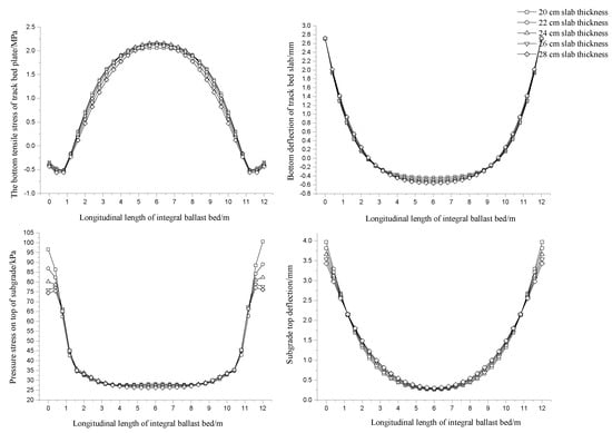 In the longitudinal direction of the track bed slab, the tensile stress basin at the bottom of the slab is convex under the condition of the same track bed slab thickness, and a phenomenon of warping is observed at the end. The horizontal tensile stress at the bottom of the track bed slab changes slightly with the increase in the thickness of the track bed slab. The track bed slab is deflection and concave, but not much. In the axial direction of the track bed and the same thickness of the track bed, the stress basin on the top surface of the soil foundation is concave, the stress on the top surface of the soil foundation reaches the maximum at the end track load position, and the deflection basin is concave. When the thickness of the track bed increases from 20 cm to 28 cm, the compressive stress reduction value of the top surface of the soil foundation is approximately 23%, and the reduction value of the deflection of the soil foundation is nearly 14%.