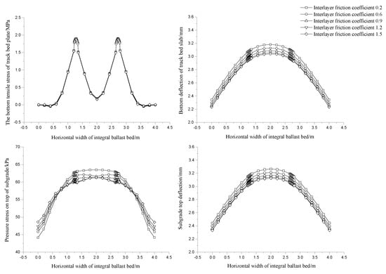 According to AASHTO2020, the friction coefficient μ between the water-stabilized base layer and the surface layer is between 3.5 and 13 (mean value is 8.9) [29]. We selected five friction coefficients of 0.2, 0.6, 0.9, 1.2, and 1.5 to compare and analyze the influence of the contact conditions between layers on the strength and deflection of the track bed slab. Table 4 shows the statistical results of the mechanical response of the bottom of the monolithic slab and the top of the soil foundation changing with the contact conditions between the slab and the supporting layer. The mechanical responses of the bottom of the integral track bed and the top surface of the soil foundation vary with the contact conditions of the track bed and the support layer as shown in Figure 7 and Figure 8.The horizontal tensile stress of the bottom of the track bed (), the deflection of the top of the slab (), the compressive stress on the top surface of the soil foundation (), and the variation in the deflection () with the contact conditions of the slab-support layer are shown in Figure 6 and Figure 7.