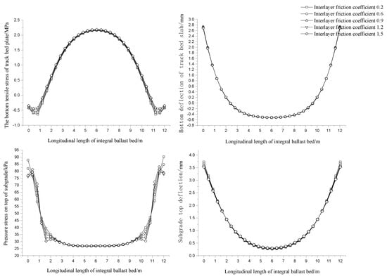In the lateral position of the track bed slab, the horizontal tensile stress of the bottom of the track bed, the compressive stress of the soil foundation, and the deflection and the top of deflection slab all slightly decrease with the increase in the friction coefficient. In general, the friction coefficient only slightly affects , , , and . In the longitudinal position of subgrade slab, the horizontal tensile stress at the bottom of subgrade slab increases slightly and the compressive stress at the top of soil foundation and the deflection and the top of deflection slab decrease slightly with the increase in friction coefficient. In general, the friction coefficient only slightly affects , , , and .