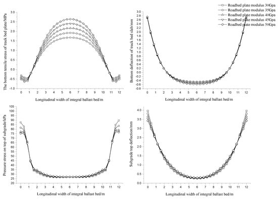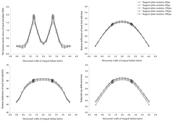 In the transverse direction of the track bed slab, the tensile stress of the slab bottom has obvious stress concentration at the place where the wheel track acts, and the horizontal tensile stress of the slab bottom decreases with the increase in the support layer modulus. When the support layer modulus is the same, the deflection value between the two wheelsets at the top of the transverse direction changes to 1.8 MPa, and the deflection value decreases slightly outside the wheelset. The increase in the modulus of the support layer decreases slightly. Under the condition of the same supporting layer modulus, the stress basin on the top surface of the soil foundation is convex, and the minimum value of the lateral change is 27% relative to the maximum value. The top surface of the subgrade is convex. When the modulus of the supporting layer is 6 GPa, the surface compressive stress reaches the maximum value of 60.644 kPa, and the top surface deflection of the subgrade is 3.119 mm.