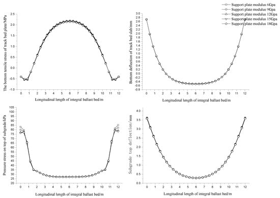We chose five kinds of support layer elastic modulus of 6, 9, 12, 15, and 18 GPa to compare and analyze the influence of the support layer modulus on the strength and deflection of the track bed slab. The statistical results of the mechanical response of the slab bottom and the top surface of the soil foundation with the change in the modulus of the supporting layer are shown in Table 6. The law of change is shown in Figure 11 and Figure 12.