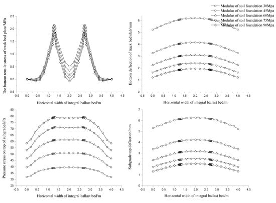 In the longitudinal direction of the track bed slab, the tensile stress basin at the bottom of the track bed slab is concave. The tensile stress at the bottom of the slab is 1.702 MPa when the soil foundation modulus is 30 MPa, and it is 2.306 MPa when the soil foundation modulus is 90 MPa. The tensile stress at the bottom of the track bed slab increases with the rise in the soil foundation modulus. The deflection of the track bed slab is concave. The maximum deflection of the track bed slab is 5.219 mm when the soil foundation modulus is 30 MPa, and it is 1.776 mm when the soil foundation modulus is 90 GPa. Under the same soil foundation strength condition, the stress basin on the top surface of the soil foundation is concave, and the deflection basin is concave up and down. When the modulus of the soil foundation increases from 30 MPa to 90 MPa, the compressive stress on the top surface of the soil foundation increases by approximately 99%, and the deflection of the foundation decreases by nearly 66%.