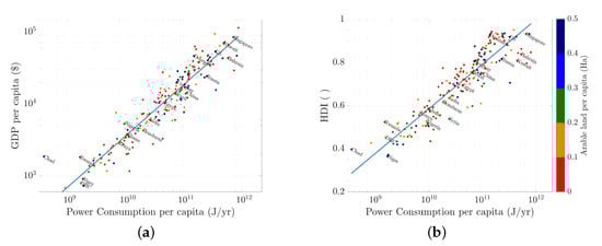 Power consumption indices. (a) Power consumption per capita versus GDP; (b) Power consumption per capita versus HDI. The color code indicates the arable land per capita. Data from UN [5], EIA [7] and FAO [8].