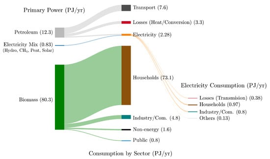 Figure 4 shows the primary power consumption by source in Rwanda. Because detailed information is missing, the electricity generation mix (except for diesel fuel and heavy oil) is lumped. The estimated losses of petroleum are due to thermodynamic efficiency of power conversion assumed to be 30% [45]. In addition, electricity losses are estimated at approximately 20%, mainly due to theft and technical issues [46]. From the perspective provided by the power flows, we can understand the significant role of biomass as cooking fuel and identify Rwanda’s underdevelopment.