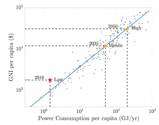 Rwanda’s power requirements for development. The red star is the current status of Rwanda; The gold stars show the goals of Rwanda’s government to become a middle and high-income country by 2035 and 2050, respectively. It shows the average value of GNI and power consumption per capita based on the global trend. The blue line is the global trend, while the gray dots represent the countries in 2016. The data are from [7,51].