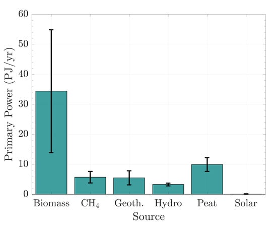 Primary power potentially available in Rwanda. Solar power refers to currently installed and planned installations. Error bars are based on estimation bounds. The data were reported by MININFRA [37,41] and Bolson et al. [48].