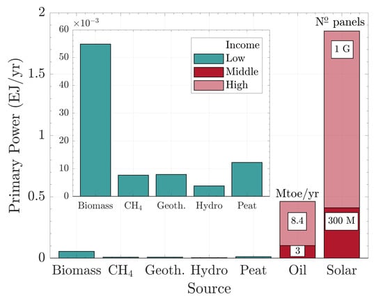 Figure 7 shows Rwanda’s power mix proposed for different income levels. For the current population, the available power resources will maintain Rwanda’s status as a low-income country that with a growing population will become even poorer. To satisfy power requirements for a middle-income country, Rwanda needs to import an equivalent of 3 toe /yr (≈20 bbl /yr) and install a nominal solar power of 90 , which is approximately 300 million panels. In the case of a high-income country, the oil imports are toe /yr (≈77 bbl /yr), and the required solar power is 400 , which implies the installation of 1.3 billion panels.