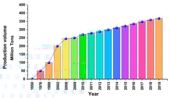 Plastic waste (e.g., plastic bottles, bags, and sheets) is not readily biodegradable, which makes it one of the most challenging sources of pollution. Worldwide, plastic waste exceeds 25 million tons per year [2]. From 1950 to 2015, only about 10% of plastic waste was recycled; the rest was disposed of in landfills or elsewhere in the environment, according to the United Nations Development Program (2019). Figure 1 shows plastic waste generation from 1950 to 2019 [3]. By 2050, landfills and the natural environment will contain approximately 12 billion tons of plastic litter due to current consumption patterns and waste management practices [1]. Hence, there have been various efforts around the world, particularly in developed countries, to turn plastic waste into useful products [4]. There is great potential for creating new construction materials from plastic waste, since the construction industry dominates most economies and consumes the most raw materials [5].