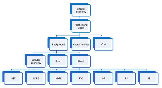 The mind map used in this literature review (Figure 2) revolves around a circular economy and the practicality of using plastic sand bricks as an alternative construction material. Therefore, it specifies that background information about the circular economy and the main ingredients of plastic sand bricks (plastic and sand) must be included to introduce the subject. Accordingly, the background section briefly addresses the circular economy, plastic, and sand. To determine the practicality of utilizing plastic sand bricks and if they are at least comparable to conventional bricks, it is important to assess the characteristics of plastic sand bricks. It is also necessary to examine the effect of the plastic type. Thus, studies on plastic sand bricks that have utilized various types of plastics have been reviewed here, with an emphasis on their physical characteristics. Comparing the cost of using plastic sand bricks and conventional bricks is also essential for assessing plastic sand bricks as an alternative construction material. Therefore, an effort has been made to report the findings from the literature on the cost of plastic sand bricks.