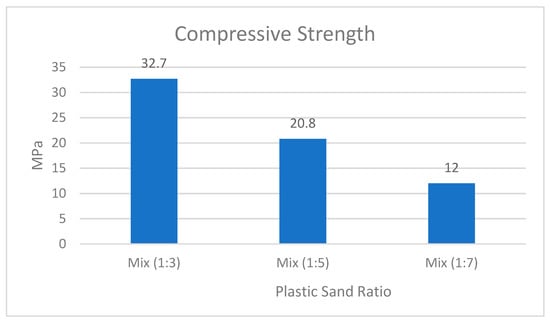 Osarumwense et al. [34] conducted a study in which molten plastics were mixed with sand to produce paving tiles at varying plastic to sand ratios (1:1, 1:2, 1:3, and 1:4). Curing took place over 28 days. Figure 3 shows the compressive strength of various plastic to sand ratios.
