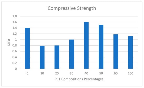 Bamigboye [45] tested the performance of roof tiles manufactured from river sand and recycled PET in varying proportions (10%, 20%, 30%, 40%, 50%, 60%, and 100% PET). The study found that 10% PET composites had the highest water absorption (2.94%), while 30% PET composites had the lowest (0.15%). Additionally, the study reported that the tile samples with the lowest density were 100% PET (852.07 kg/m3), and the samples with the highest density were 10% PET (1899.56 kg/m3). Finally, it was found that the highest value among the composite tiles was for those with 40% PET (1.59 Mpa), followed by those with 50% PET (1.48 MPa) (see Figure 5).