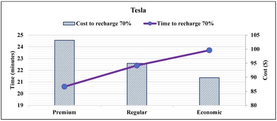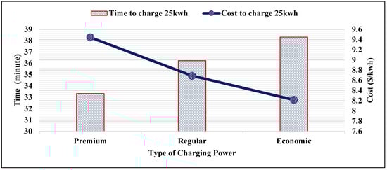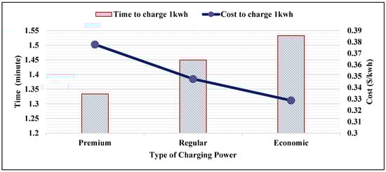 where , , and are premium, regular, and economic charging powers, respectively. The required time to charge 1 kwh is inversely proportional to rate of the charging power. As the rated power increases, the time required to charge 1 kwh decreases, and vice versa.