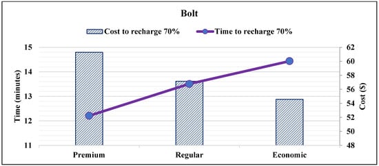 The economic charging power has the lowest cost but the highest charging duration according to its per unit cost and per unit charging time, respectively. The per unit cost of the economic charging power (.) is modeled as in Equation (27). It is a function of two factors: the per unit cost of premium charging power () and a scaling factor (). is more than which makes the scaling factor in is less than that in ; thus, the economic charging power offers more rebate. In this charging power, the rebate is modeled to reduce the per unit charging cost by the same percent that would reduce the per unit charging time if the premium charging power is utilized.