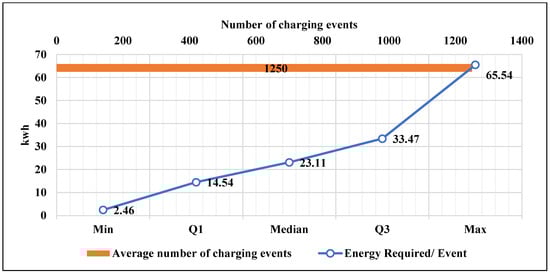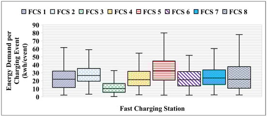 where is index for FCS, is total number of considered FCSs, , , and are the 25th, 50th, and 75th percentiles of charging energy per charging event of the FCS in a year (), and and are the maximum and minimum of charging energy levels, per charging event of the FCS in a year. The maximum values in the constructed FCS profile is calculated by finding the average of all maximum values extracted from each FCS profile as shown in Equation (44). Similarly, the minimum value of each FCS profile is collected and then averaged to construct the minimum value in the constructed FCS profile as in Equation (45). The three sample quartiles () in the constructed FCS profile are determined by collecting the first, second, and third quartiles of each FCS and then independently finding their average as in Equations (46)–(48) below: